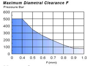 Note: Clearance gap F is the maximum permissable. i.e. gap completely on one side, in the temperature range of -30°C to 80°C The use of a suitably selected Claron bearing ring will effectively reduce the clearance gap F max. to a value closer to F/2 thus increasing the pressure capability of the seal.