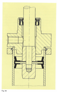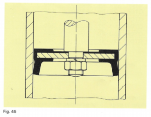 Kaco Double cup seals are complete pistons for a pressure range up to 16 bar for sealing liquid and gaseous media. In this version, two cup seals are vulcanized to a metal washer which serves as a reinforcement for clamping onto the piston rod. One side of this washer has a rubber layer which, when installed, carries out sealing on the piston rod (fig. 44). The radial tension of the sealing lips is such that, even in the case of radial stressing of the piston rod and even if the guide clearance between the piston and cylinder is used to the full, a cylinder tolerance up to H 11 is still covered. With the sharp sealing edges, it is possible to seal off liquid media (e.g. hydropneumatic equipment, hydro-apportioning equipment).