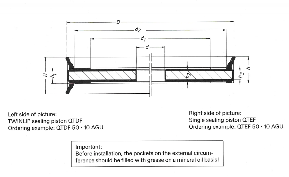 If the simple version of the sealing piston is used, the sealing lip not subjected to pressure is removed. Refer to the table on page 39 for the installation dimensions of single-type QTEF sealing pistons. Due to the symmetrical structure of these sealing pistons, it does no matter from which side a sealing lip is removed. This is advantageous for installation and for keeping spare parts.