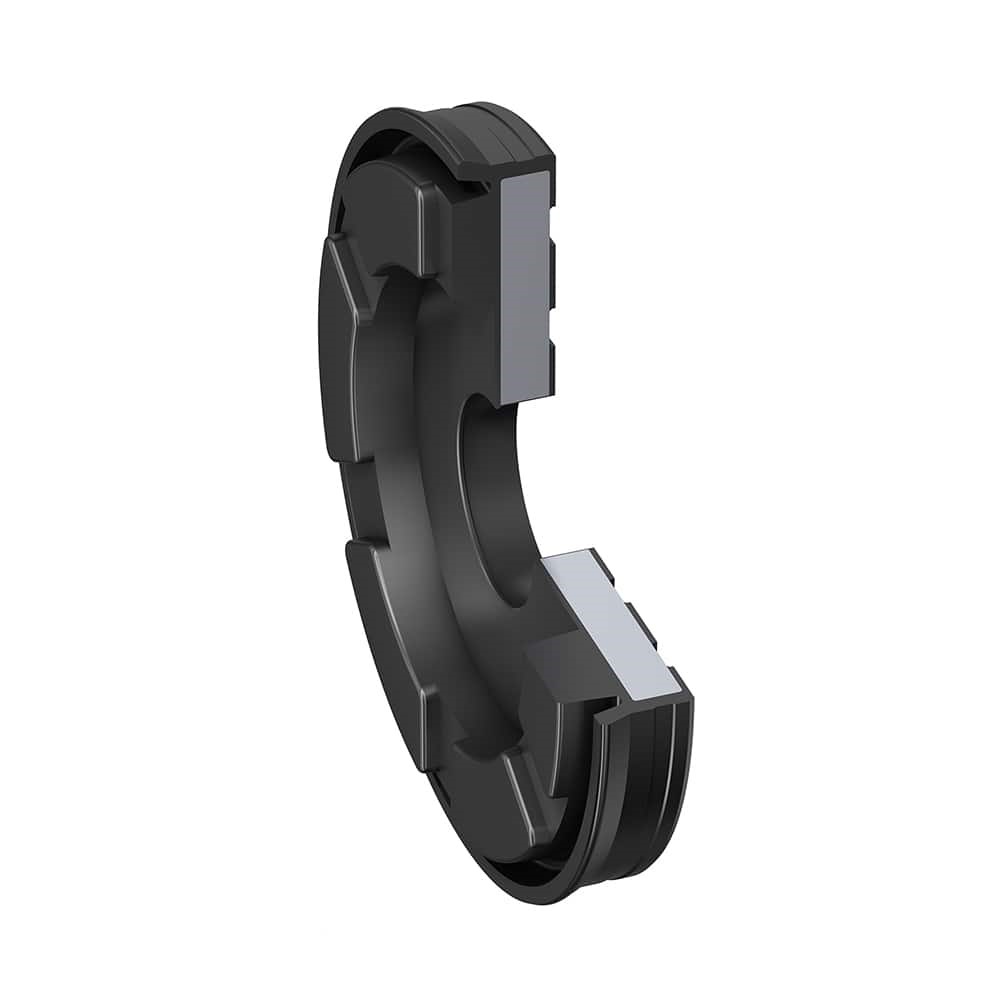 The single-acting Parker Prädifa pneumatic complete piston DE is a two-component seal design, consisting of a metallic carrier with a vulcanized guiding surface and sealing lip. The complete piston performs three functions: sealing, guiding, and end-position cushioning.