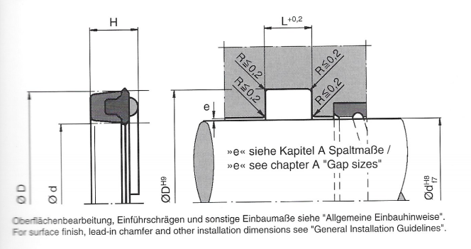 When specifying the sealing area it must be taken into consideration that the pressure can fully act upon the seal. Therefore there must be some clearance in the axial direction. To avoid damaging the sealing edges, care should be taken that the seals are not drawn over sharp edges during installation.
